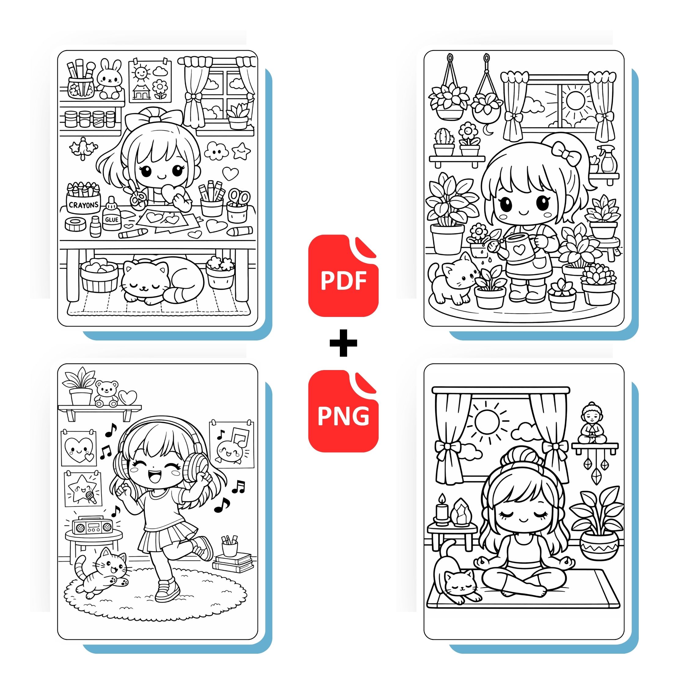Cute and kawaii cozy daily life coloring book for girls! 30 relaxing pages with charming routines and scenes. Instant PDF + PNG download.