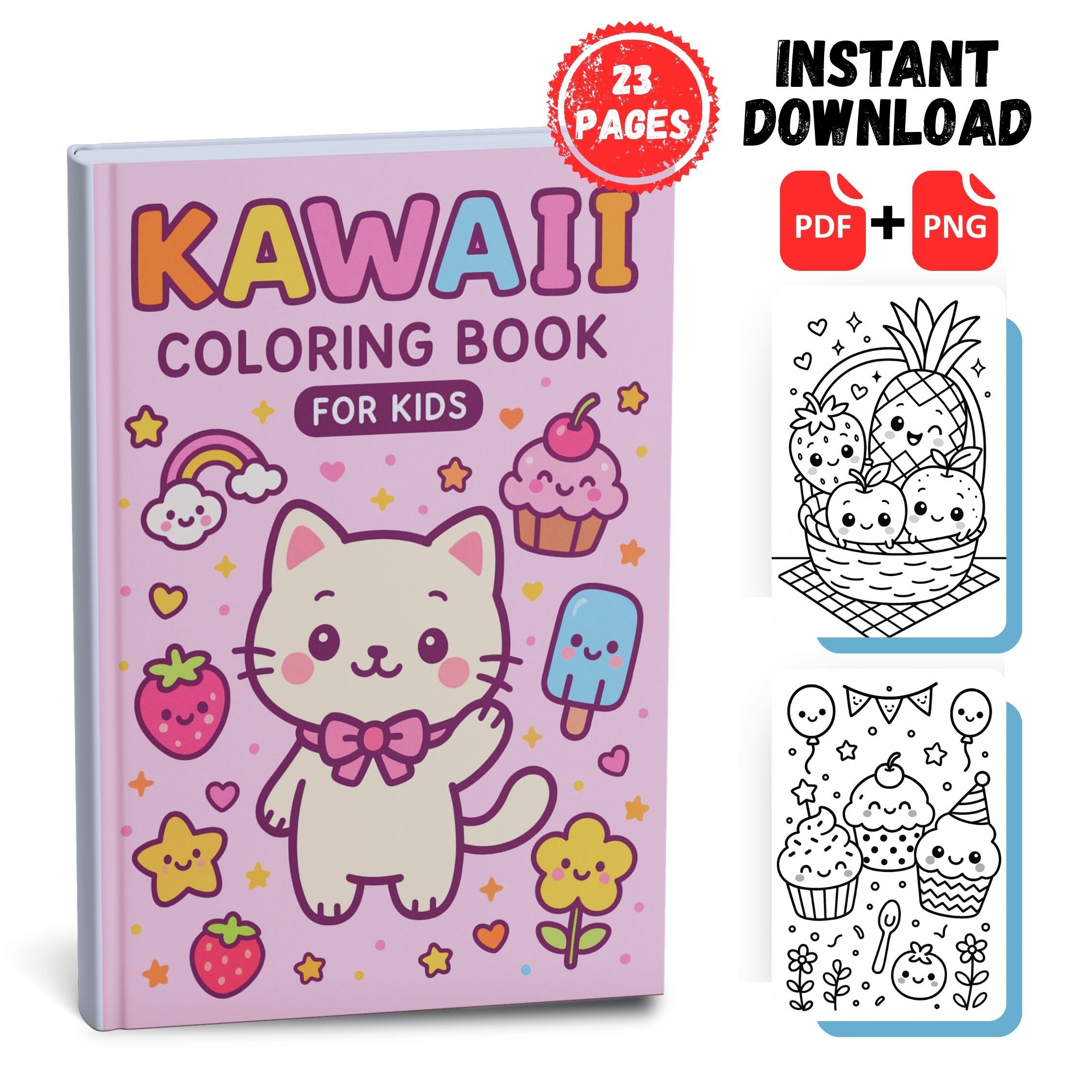 Adorable kawaii coloring book for kids! 23 cute pages perfect for girls. Instant PDF + PNG download for hours of fun and creativity!